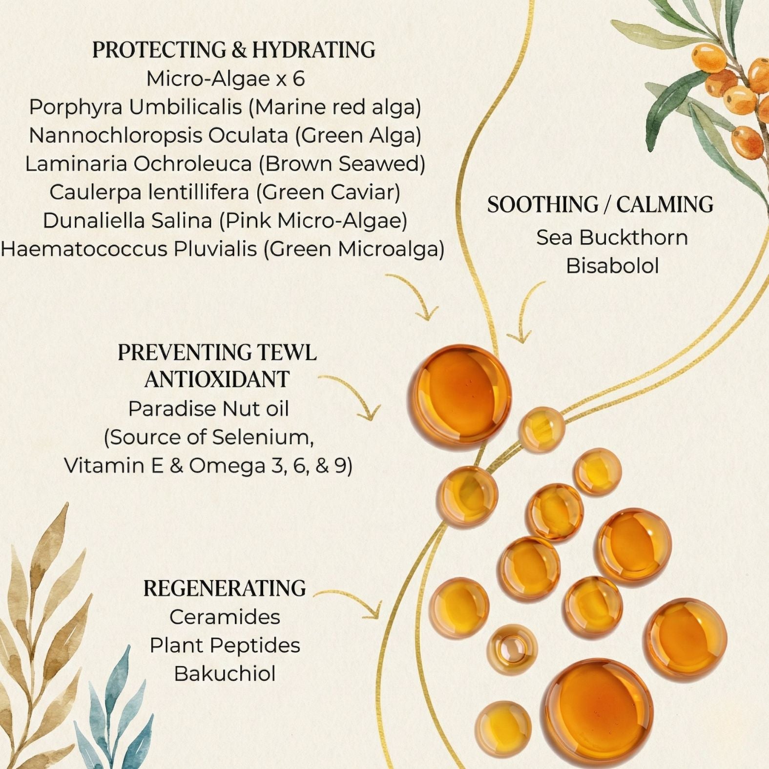 Lecythis Minor (Paradise Nut) Seed Oil, Silybum Marianum (Milk Thistle) Seed Oil, Orbignya Oleifera (Babassu) Seed Oil, Simmondsia Chinensis (Jojoba) Oil, Olive Squalene, Porphyra Umbilicalis (Red Alga) Extract, Nannochloropsis Oculata (Green Alga) Extract, Glycine Soja (Soybean) Seed Extract & Ceramide Np, Caprylic/Capric Triglyceride, Laminaria Ochroleuca (Brown Seawed) Extract, Helianthus Annuus (Sunflower) Seed Oil And Lupinus Albus (White Lupin) Seed Extract, Pongamia Glabra (Karanja) Seed Oil, Dunaliella Salina (Pink Micro-Algae Rich In Carotenoids) Extract, Haematococcus Pluvialis (Green Microalga Rich In Astaxanthin) Extract, Caulerpa Lentillifera (Green Caviar Rich In Β-Glucan) Oil, Brassica Campestris (Rapeseed) /Aleurites Fordi (China Wood) Oil Copolymer, Bisabolol, Tetrahexyldecyl Ascorbate (Vitamin C), Bakuchiol, Tocopherol, Punica Granatum (Pomegranate) Sterols, Rubus Idaeus (Raspberry) Extract, Hippophae Rhamnoides (Sea Buckthorn) Fruit Oil, Pandanus Conoideus (Buah Merah) Fruit Oil, Citrus Aurantium Dulcis (Orange) Flower Extract, Jasminum Officinale (Jasmine) Oil, Pogostemon Cablin (Patchouli) Leaf Extract.
