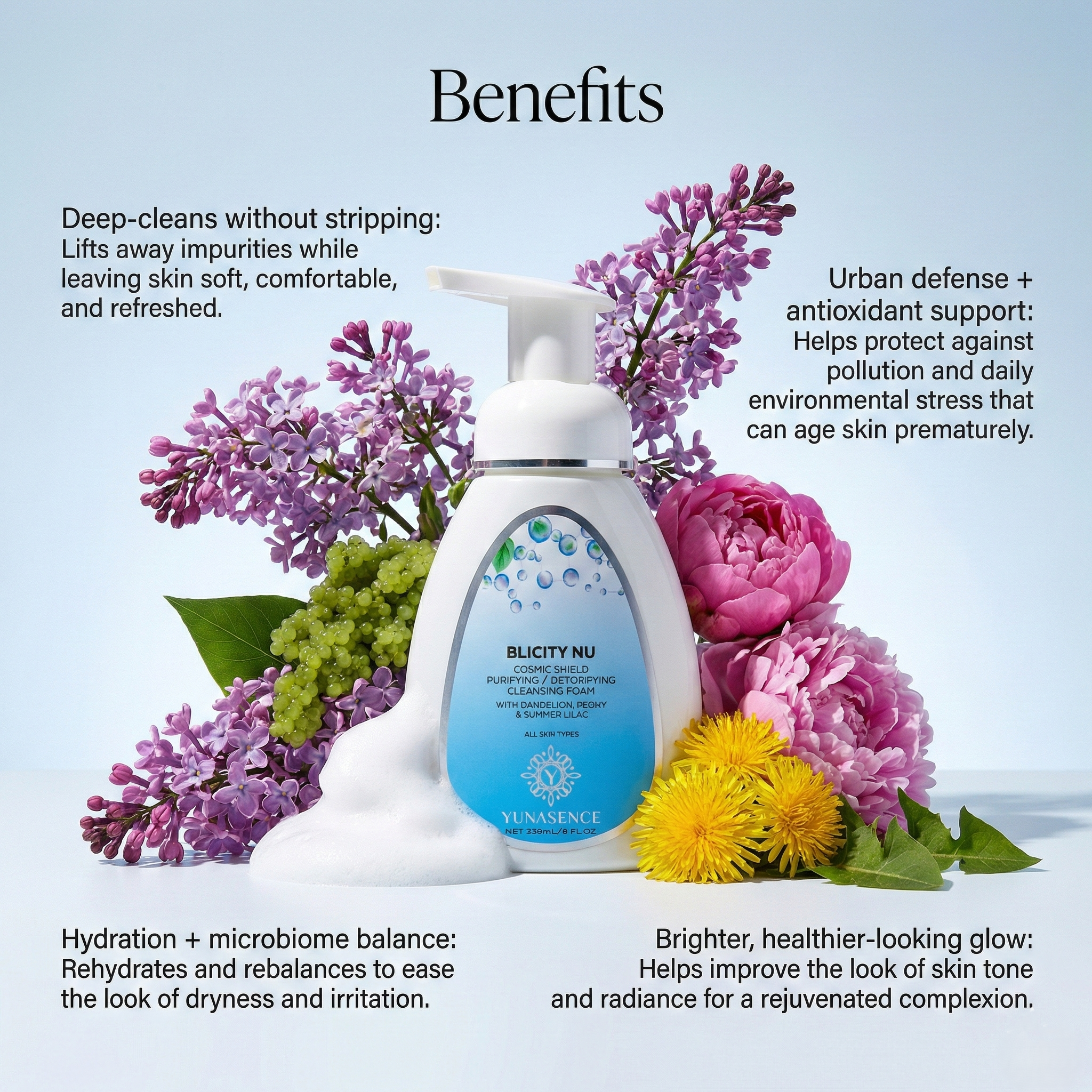 This gentle, all-natural formula cleanses and nourishes the skin while defending against city stress and pollution. It balances the microbiome, boosts radiance, and fights free radicals to support youthful, refreshed, and comfortable skin.